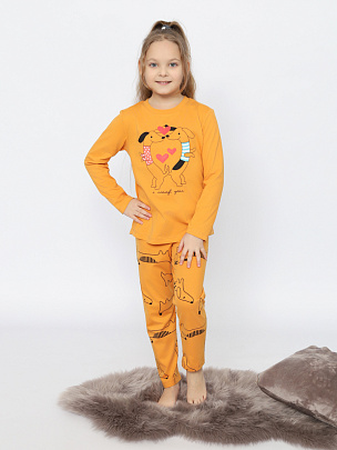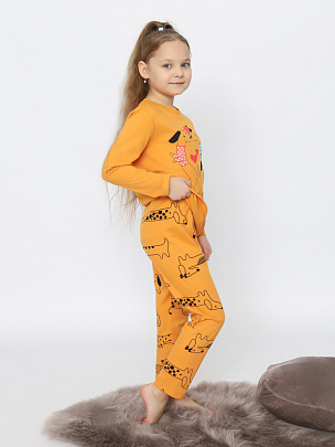 Комбинированная пижама из джемпера и брюк. Джемпер гладкокрашенный, свободного покроя с длинным рукавом. Горловина обработана притачной бейкой из рибаны с лайкрой. Перед оформлен принтом. Прямые брюки умеренного объёма выполнены из набивного полотна. Цельнокроенный пояс обработан плоским швом вподгибку с одновременным прокладыванием резинки.