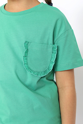 Футболка со спущенным плечом и короткими рукавами. Спереди карман декорирован ришелье. Горловина круглая, обработана притачной бейкой. По ростку горловины шов притачивания закрыт долевиком.