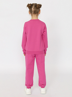 Джемпер для девочки с длинными рукавами. Горловина, рукава и низ изделия с эластичной резинкой. На полочке декоративный принт с блестящим эффектом и надписью - "Улыбнись". Брюки-джоггеры без карманов. Пояс притачной, со вставленной внутрь резинкой. В пояс вставлен шнур. Спереди деворативный принт с блестящим эффектом и надписью - "Привет". Внизу манжеты.