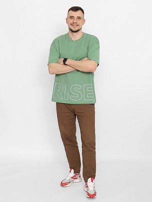 Футболка прямого силуэта длиной до бедер. Короткий рукав. Круглая горловина обработана узкой притачной обтачкой из рибаны с эластаном. Полочка декорирована принтом и текстильной нашивкой "ясное будущее естественное и аутентичное".