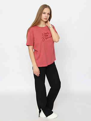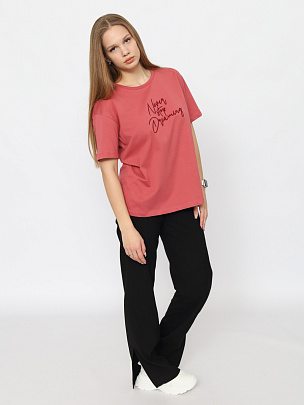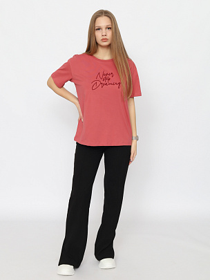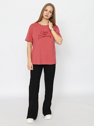 Футболка прямого силуэта длиной по  линию бедер. Короткий рукав. Круглая горловина обработана узкой  притачной обтачкой из рибаны с эластаном. Полочка декорирована вышивкой "никогда не переставай мечтать".