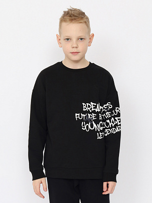 Джемпер для мальчика со спущеным плечом. Рукав втачной с манжетами. Боковые швы джемпера смещены на полочку, низ джемпера обработан поясом с разрезами. Воротник-стойка отложной. Манжеты и пояс выполнены из основного материала.