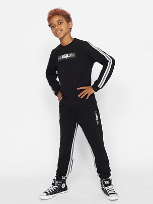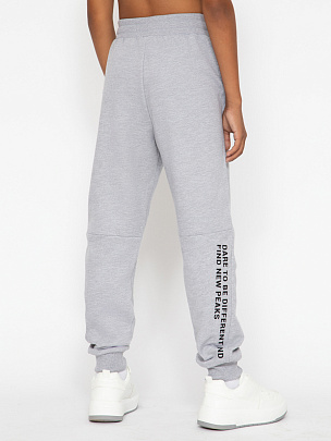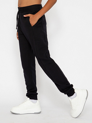 Брюки с притачным поясом и манжетами. В пояс вставлена резинка и функциональный шнур. Пояс и манжеты выполнены из полотна с эластаном. В боковой части брюк располагаются карманы. На передней части в области колена расположен декоративный подрез. На задней части брюк расположена декоративная вставка контрастного цвета. Карман декорирован вязаной нашивкой.