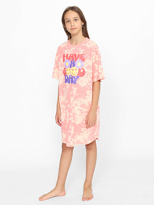 Ночная сорочка, домашнее платье, туника для девочки оверсайз с коротким рукавом, средней длины и свободного кроя, подходит к фигуре любого типа. Стильная, модная, туника для девочки-подростка выполнена из 100% органического хлопка. Легкая и дышащая текстура материала подарит комфортные ощущения. Перед декорирован трендовым принтом (надпись: Хорошего дня).