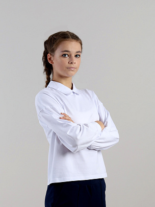 Джемпер для девочки с длинными рукавами и отложным воротником из кулирки, свободного силуэта. Рукава объемные, со спущенным плечом, снизу манжет из кулирки. Спинка с вырезом-капелькой и застёжкой на пуговицу-бусину с петлёй.