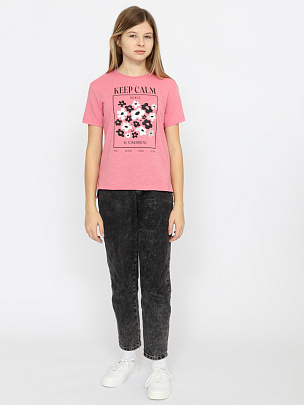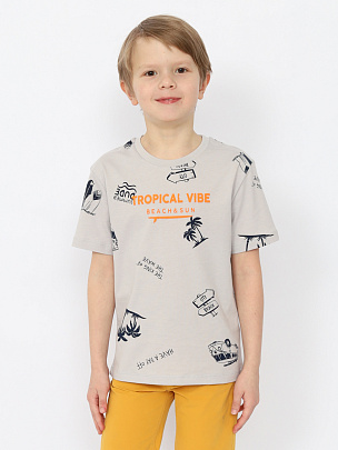 Футболка с коротким рукавом. Горловина круглая, обработана узким воротником из полотна с эластаном. Перед оформлен принтом.